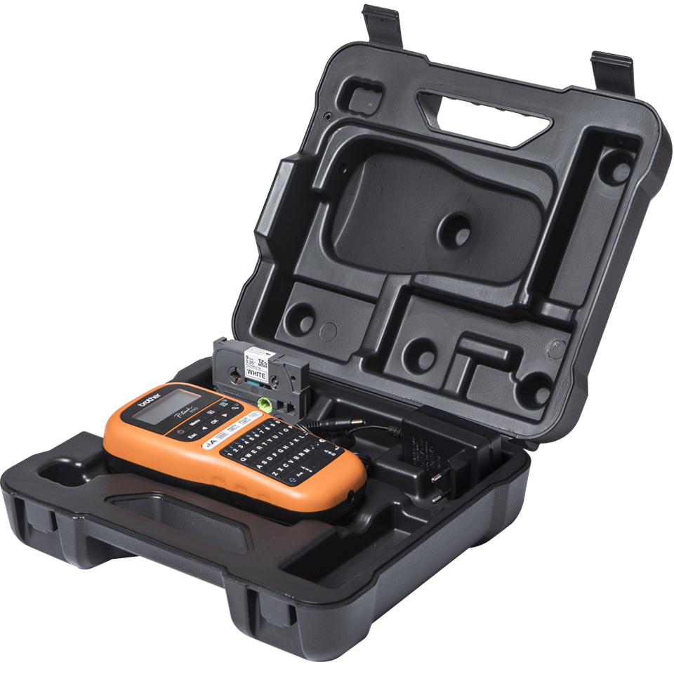 Профессиональный принтер для печати наклеек Brother PTE-110VP (ручной, русская клавиатура, поддерживается ширина лент от 3,5 до 12мм, скорость печати 20мм/сек, кейс и адаптер в комплекте, в комплекте лента TZEFX221)
