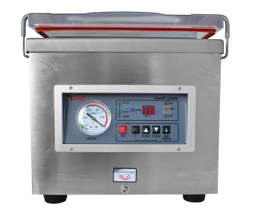 Вакуумный упаковщик на одну пачку CmE 1100. Скорость упаковки: 4 пакета в минуту, производительность насоса: 6 м3/час, длина сварочной планки: 262 мм, функция отрезания. Вес 35 кг